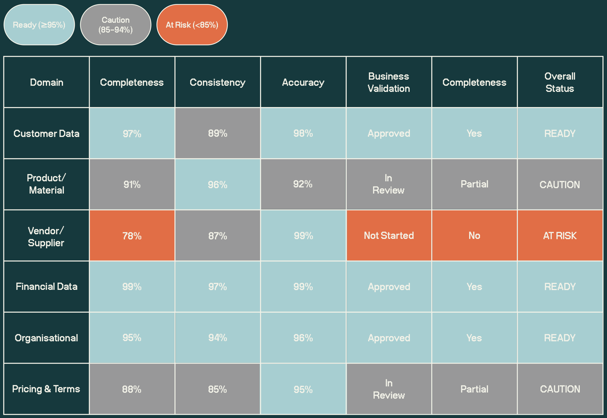 Governance structures must support this ownership, which includes setting up a master data council or similar forum where key stakeholders across functions and geographies can review progress, make decisions, and resolve exceptions. Data quality dashboards, issue logs, and structured review cycles help ensure that issues are identified and addressed in time. Rather than formal checklists, many organisations benefit from lightweight readiness scorecards that track each domain’s progress across key criteria such as completeness, alignment, validation, and approval. These tools provide visibility and accountability without becoming administrative burdens.